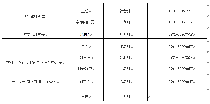 学院管理部门有党政办、教务办、学工办(就业、团委)、学科与科研(研究生管理)办、工会和各相关秘书。