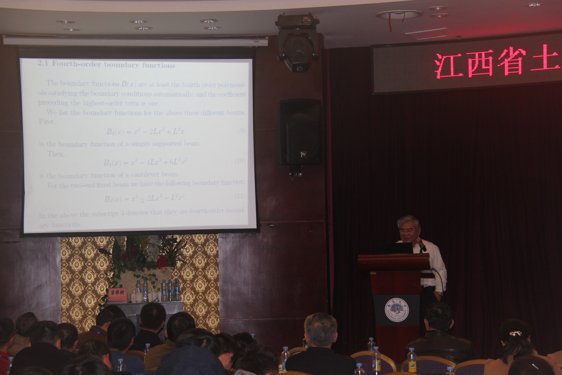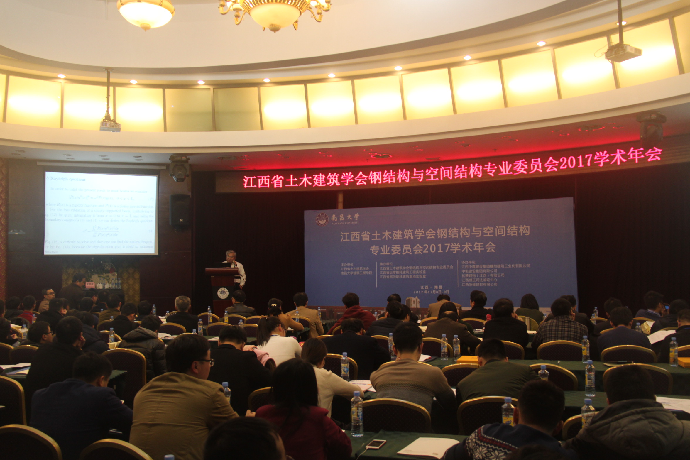 2017年12月9日,由南昌大学建筑工程学院和江西省土木建筑学会共同主办的钢结构与空间结构专业委员会2017学术年会在前湖大厦多功能会议厅召开。国家千人计划学者、台湾大学刘进贤教授应邀出席会议,并以“An upper bound theory to approximate the natural frequencies and parameters identification of composite beams(组合梁固有频率拟合和参数识别的上边界理论)”为题,为大家带来了一场精彩而有深度的特邀学术报告。报告由建筑工程学院院长熊进刚教授主持,省住房和城乡建设厅党组成员、总工程师章雪儿教授级高工,井冈山大学副校长桂国庆教授,江西省土木建筑学会理事长许秋华教授级高工,江西省土木建筑学会秘书长李永平,省住房和城乡建设厅罗宇萍处长等专家学者出席报告会,150余名参会代表和研究生聆听了报告。