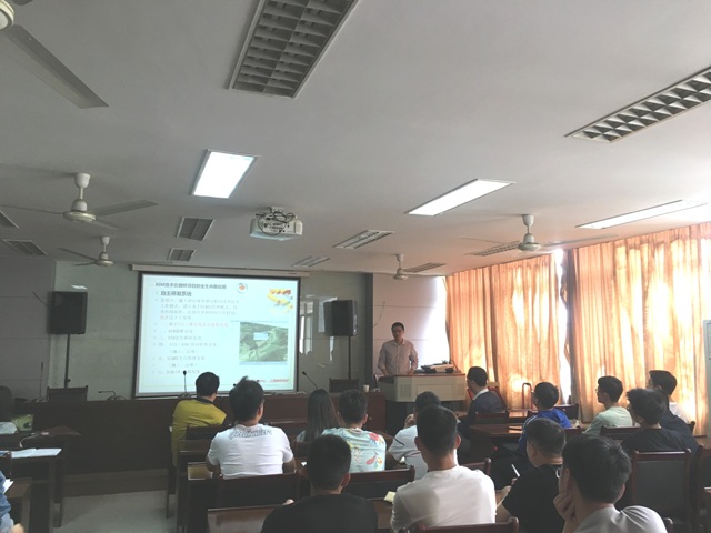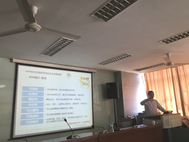 本网讯(通讯员:胡峰强)2019年5月10日上午,江西省交通设计研究院有限责任公司BIM技术研发专家朱海涛高级工程师应邀来我院进行学术交流,在建工楼B421报告厅做了题为《BIM技术在路桥项目全生命周期的应用》的学术报告。报告会由道桥教研室胡峰强主任主持,我院土木工程系道桥专业的教师、研究生和本科生认真聆听了报告。